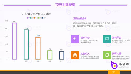 6、2018年直播行业顶级主播平台分布:数据采样自全年小葫芦指数综合得分前一万名主播,平台仅展示TOP5的平台。YY平台在一万名主播中占据2353位,几近占据了四分之一的主播数量,才艺帅哥靓女主播的吸金能力有目共睹,能够有如此数量级的顶级主播得益于精细化运营。虎牙和斗鱼更为重视游戏直播,分别1917和1443位主播,大部分均为游戏主播,为游戏直播行业做出了巨大的贡献。礼物收入、弹幕条数和弹幕人数都是影响主播排名的重要标准,排名前三的平台在礼物和弹幕方面均是前列,主播和平台的排名其实是息息相关的。