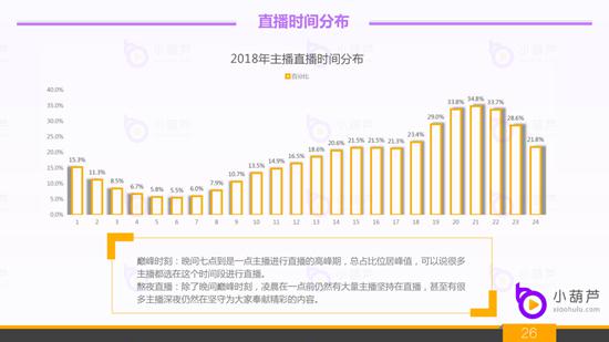 5、2018年直播行业粉丝的互动频次:据小葫芦数据统计,粉丝与主播互动的活跃时间段为晚间,峰值在晚间的21点,结束一天的辛苦在直播间和主播进行互动;深夜互动频次明显降低,不过也有部分用户和主播均属于夜猫子类型,在此时间段仍然会产生互动。友情提示:在晚间9:15的时候进行互动效果可能是最佳的,若有活动要进行推广,此时间段得到的效果可以说是事半功倍。