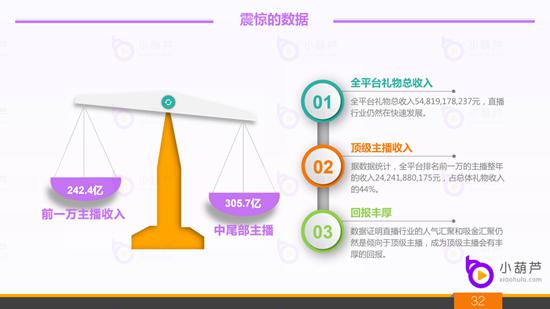 7、2018年直播行业领军收入对比:全平台礼物收入为548亿元,小葫芦指数综合排名前一万名的主播礼物收入总和就已经达到了242.4亿元,占总比收入的44%,头部主播的吸金能力实力强劲。这也侧面说明作为主播行业,只要能够在人气,用户方面有所累计,赚钱效应也是非常之高的,但能够成功的人数占比相对也是较小的,这也就造就了很多为了吸引眼球剑走偏锋的一些例子,虽然收益高,还是要走正途方能安心。