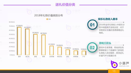 5、2018年直播行业送礼价值分类分布:2018年吸金分类中游戏直播和娱乐直播中,娱乐主播的吸金能力明显强于游戏主播,观众粉丝们对于帅哥美女还是比较没有抵抗力,喜爱美事人的一种本能的天性。星秀,脱口秀,颜值,歌舞的礼物收入在2018年颇为丰厚,入门门槛只要人美歌甜,主播基数上也呈现了量化。游戏方面王者荣耀,绝地求生和英雄联盟在2018年火热的三个游戏依旧不缺席,虽然礼物收入不及娱乐分类,但整体的收入占比也是很大的比例了。