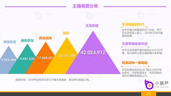 5、2018年直播行业直播分类数据:全年主播体量较大,这里我们采样了小葫芦主播全年指数综合评估前三万名巅峰主播的分类数据。从这些主播分类中可以看出在2018年直播行业中歌舞和娱乐仍然占据大头,在TOP5分类中娱乐项相关占据四席的情况下,王者荣耀仍然一枝独秀,可见这款现象级的手游在2018年仍然是最受欢迎的直播游戏。接下来的绝地求生和英雄联盟无疑都在分类前列,2018年大红大紫的绝地求生上线迅速引爆直播热潮,从而诞生了诸多知名的游戏主播。虽然分类排名中略高于英雄联盟,但热度在后半年却被英雄联盟有所赶超,这个在下面的内容中会有详细分析。