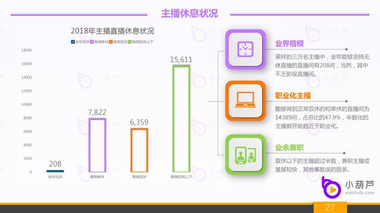 2、2018年直播行业主播休息状况:数据选自小葫芦主播全年指数综合评估前三万名巅峰主播的休息数据。采样的三万名主播中,有208间直播间全年无休,能够做到全年无休的都是意志力坚韧的主播,当然影视直播间就要除外了。单双休的主播占比位14389位,占总比的47.9%,这批主播基本上已经做到了职业化,付出相对也就更多一些了。双休以下的占比超过半数,兼职主播,或者事情耽误的,导致无法达到预期效果的,能够在巅峰三万主播中,付出也是大于常人的。