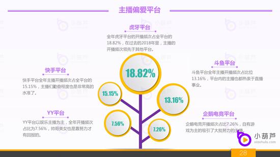 3、2018年直播行业主播偏爱的平台:偏爱数据我们选自开播频次,开播频次侧面反映主播对于直播的热忱度。开播频次最高的是虎牙平台,占比18.82%,其次是快手和斗鱼平台,占比分别是15.15%和13.16%;YY平台和企鹅电竞的开播频次占比分别是7.56%和7.26%,位居第四和第五位。