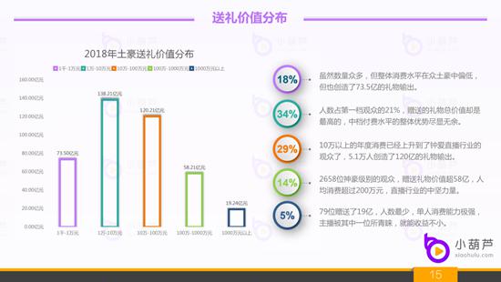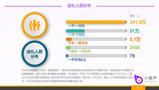 3、2018年直播行业送礼土豪的人数区间分布:2018年是直播的丰收年,小葫芦数根据年付费超千元的数据模型统计,超过百万数量级的土豪活跃在各个直播平台内。其中小型土豪的数量占比最高,年付费在一千到一万之间的观众人数更是超过了241.5万人。超过十万元年付费礼物的观众人数中有2658名观众年消费在一百万至一千万之间,超过一千万的终极观众人数79位,可以说这批观众走到任何直播间都会被主播奉为座上宾。换个方位来说,也就是直播行业的半壁江山也就是靠着这几十万人打下来了,可见真正土豪的消费能力真的是不可想象的。