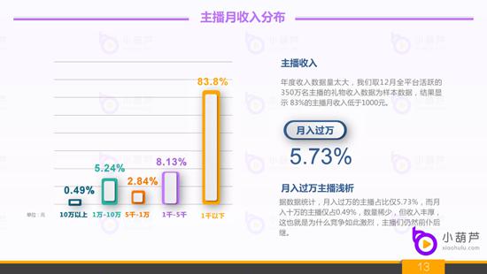 2、2018年直播行业主播月收入区间分布:小葫芦大数据取自12月份全平台活跃的350万名主播的礼物收入数据作为样本分析而得。这350万名主播中,能够月入万元的主播占比5.73%。这其中只有渺渺无几的主播能够做到收入颇丰,仅有0.49%的主播能够做到月入十万级别。行业内外基本上都只看到了这部分成功的主播,并未看到剩下的83.8%的主播月礼物收入不超过千元,加上平台分成,大部分主播是很难依靠直播行业来生存的。