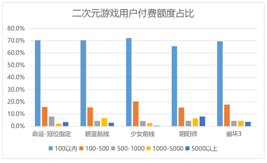 二次元游戏用户付费意愿普遍较强,显示出较强的吸金能力。图表中五款游戏,愿意在游戏中投入100元以上的用户占了三成,其中,《阴阳师》用户中付费1000~5000元的占6.6%、付费5000元以上的甚至占到8%。