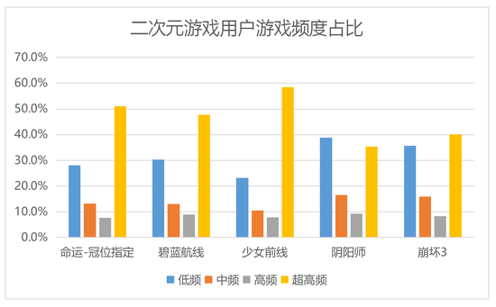 二次元游戏的粘性普遍较高,《命运/冠位指定》的用户中有一半以上属于“超高频”玩家(连续7天以上产生游戏行为),而《少女前线》的超高频用户甚至达到了58.5%。