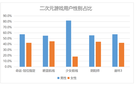 在性别分布上,除了《少女前线》这样明显以男性玩家作为服务对象的“枪娘养成系”、《奇迹暖暖》这样取悦女性为主的“换装养成”,大多二次元游戏的玩家性别都在六四开、五五开这样的范围区间里。