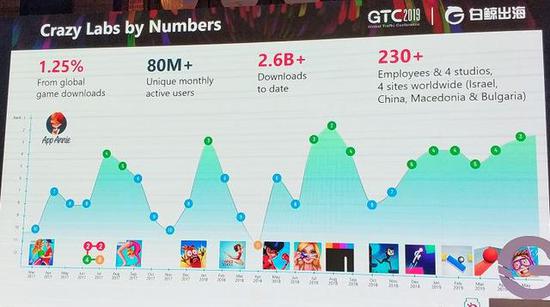 Crazy Labs2010年成立,总部在以色列,在中国、欧洲的马其顿以及保加利亚都有办公室,在全球游戏下载量里面我们占到了1.25%,位列全球前10。目前公司MAU超过8千万,游戏总下载量超过26亿。