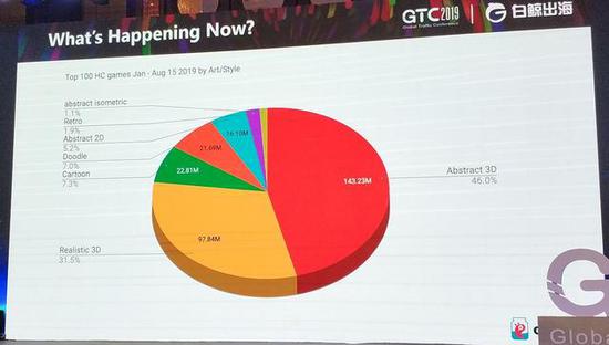 大家可以先关注红色这一块,红色这一块是抽象化3D超休闲游戏,左下角的黄色的部分比较偏向写实派的3D超休闲游戏,3D类游戏下载量在总体下载量中比例接近80%。