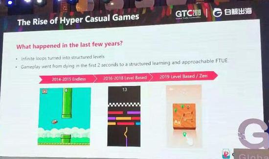 游戏玩家群体的变化造成玩法和操控设计的演变,早期超休闲游戏就像《Flappy Bird》,玩法简单,流程无限循环;2016年到2018年之间,游戏开始变成关卡制,虽然说是关卡,但其实是把无限循环的Loop切成一小片一小片的片段;后来,超休闲游戏开始出现真的关卡,开始有不同的内容和元素。