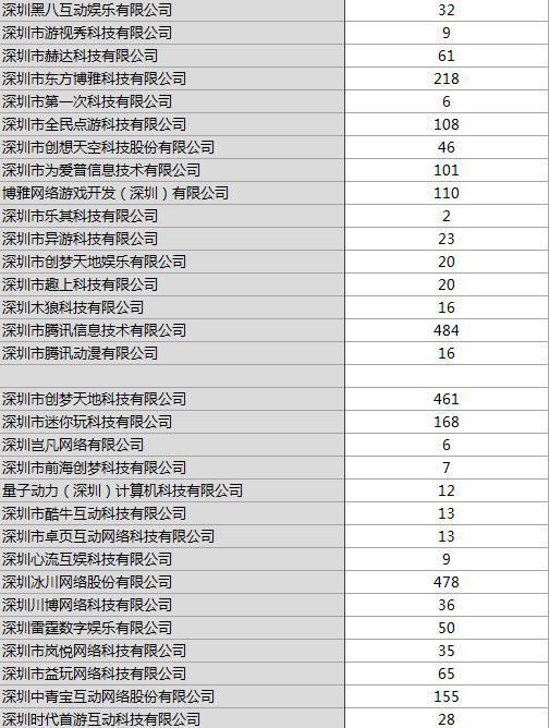 它们分别为:深圳中青宝互动网络公司、深圳冰川网络公司、深圳市迷你玩科技公司、深圳市创梦天地公司、深圳市腾讯信息技术公司、博雅网络游戏开发(深圳)有限公司、深圳市为爱普信息公司、深圳市全民点游公司、深圳市小象互娱公司、深圳市拇指游玩公司、深圳市大梦龙途公司、深圳市爱贝信息公司、深圳市畅娱天下公司、深圳游禧公司、尚娱软件(深圳)公司、深圳市迅龙创威公司、深圳市天天爱公司、深圳市望尘公司、深圳市前海幻境公司、深圳市乐讯公司、深圳市腾讯网络信息公司等。