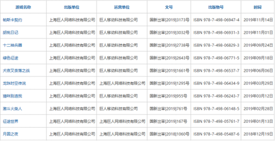 据原国家新闻出版广电总局官方显示,2018年12月29日版号重新开放以来,巨人网络已有《月圆之夜》、《胡桃日记》、《十二神兵器》等10款游戏获批。