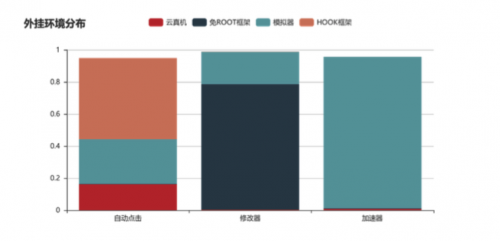 风险环境是指具有一定开挂风险,或者可以为作弊提供便利的手机环境。随着手机ROOT难度的增加,多数外挂使用者选择了模拟器、免ROO框架或者云真机进行游戏,方便使用外挂作弊。目前,主要的风险环境包括: