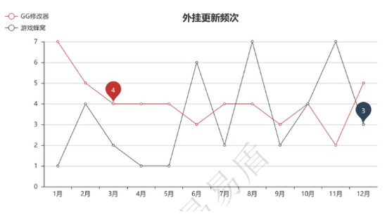 整体上,外挂更新频率呈现越来越高的趋势。具体来看,蜂窝助手、GG 修改器等更新频次表现非常明显。易盾智能手游反外挂在2019年监控到的辅助更新情况如下: