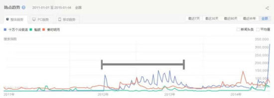 根据百度指数的统计,《十万个冷笑话》和《魁拔》、《秦时明月》在热度上的致命差异,就在于“动画化”的阶段:《魁拔》和《秦时明月》都选择了优先向传统电视台供片)——因为可以直接拿到销售收入——但是《十万个冷笑话》则是沿袭了网络自制剧的线路,直接接入合作方爱奇艺的庞大流量,全网输出内容,最大限度的探测到了受众边界。