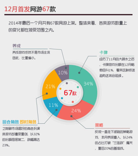 15日,当乐游戏中心发布了12月手游数据。在2014年的最后一个月份,在当乐首发的手机网游产品共67款,其中卡牌产品占比34%,比11月略有回升;策略类游戏迎来强势反弹,高达24%;而养成类网游仅占10%,短期之内仍然难成气候;回合RPG占比21%,即时RPG占比11%,RPG类产品已高达33%。