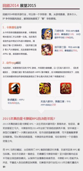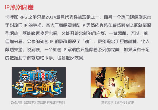 除了卡牌与RPG的争夺之外,2014年另一看点是“IP版权之战”。原著本身拥有的粉丝群,已经让大小游戏厂商垂涎欲滴——抢到一部热门作品的版权,无异于成功了一半。2014年不少手游产品打着IP的擦边球大赚了一把——虽然与原著同名,但游戏主线、副线与原著并无太多关联。进入2015年,版权管理将越来越规范、严格,玩家的口味约会越来越刁,“擦边球”已经没有太多操作空间和前景,CP们想要借助IP获利,必须要拿出真金白银与足够的诚意,同时,更要了解原著的精髓,就如当乐小编所说,再知名的IP,承载的也只是原著的完美,如果没有对原著入木三分的了解,改编出的手游产品仍然无法逃脱打酱油的命运。