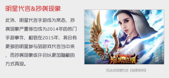 现在各行各业、各个领域都能看到一种人的身影,那就是明星!清新靓丽的面容、火爆热辣的身材使他们一亮相便备受瞩目。随着手游市场的不断发展,当题材、玩法已经无法满足玩家的需求时,找明星代言就自然成了吸引玩家的又一重磅举措。无论是竞速类、体育类或是其他类型游戏,厂商都是挖空了心思寻找符明星代言人,制造各种话题,于是,“爆乳女神柳岩“、”范爷范冰冰“、“最胖小龙女陈妍希”、“闹太套教主黄晓明“、”根本停不下来的小彩旗“,甚至还有冠军教头里皮……这些原本应该出现在文体娱乐版的明星,如今也出现在手游媒体的页面上。明星代言确实让不少厂商尝到了甜头,如柳岩代言的《神庙逃亡2》以及范冰冰代言的《暗黑黎明》等,都因为明星效应大火了一把。因此,当乐小编预测,2015年,还将会有个更多耳熟能详的名字与手游关联在一起。