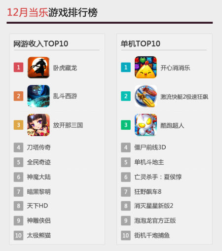 在2014年最后一个月的网游收入榜与下载榜上,仍然是那些熟悉的名字:《卧虎藏龙》、《放开那三国》、《刀塔传奇》、《暗黑黎明》、《乱斗西游》、《天龙八部3D》、《神魔大陆》、《全民奇迹》等等,精良的品质让这些游戏几乎整年占据着收入与下载榜。但这也从侧面证明,精品手游的比重极低。据当乐全年的手游数据显示,2014年当乐首发的手机网游达到800款,平均每个月都有约67款产品首发,但能占据当乐月榜与玩家手机的产品只有这10几款,中国的手游产业亟需精品!