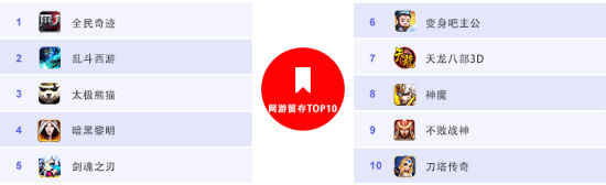 网游留存方面,实力不俗的《全民奇迹》在留存榜中亦有上佳表现,摘得头筹,可谓“叫好又叫座”。