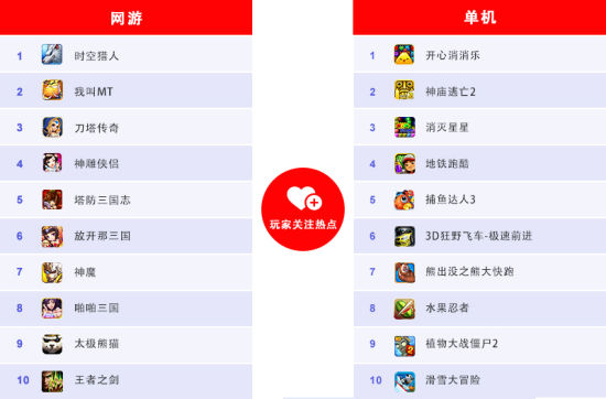 最受玩家关注TOP10榜网游方面,《时空猎人》、《我叫MT》、《刀塔传奇》排名前三的,卡牌及动作类手游仍然极受欢迎。另一方面,《神雕侠侣》、《塔防三国志》、《啪啪三国》、《王者之剑》等四款游戏新晋TOP10,这也一定程度显示出游戏用户“朝三暮四”的兴趣切换特性,对于开发者而言需不断做好游戏的长期优化,以长久留存用户。