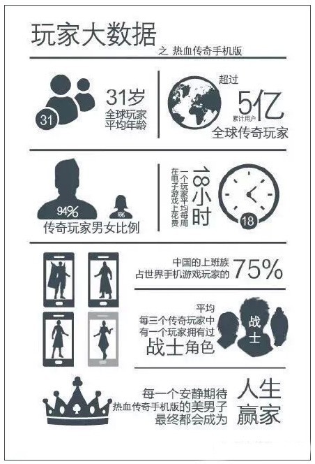 日前,盛大游戏公布了传奇类游戏14年运营相关数据图,其中提及全球传奇玩家累计人数已超5亿,平均年龄达31岁。其中男性玩家占比94%,每周在游戏上平均花费时间为18小时。