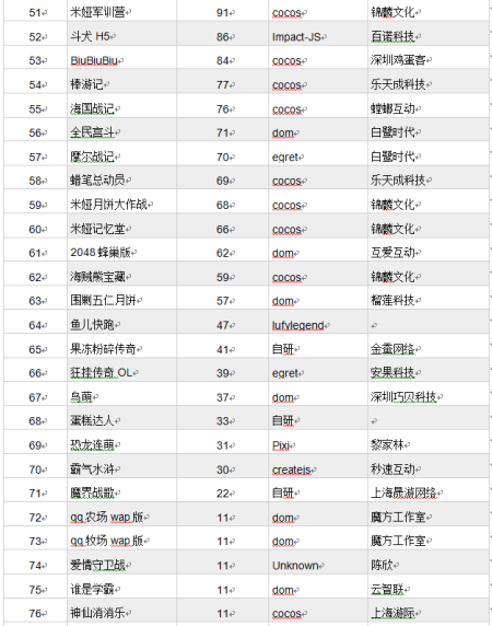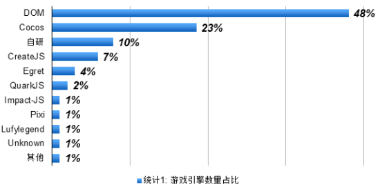 HTML5游戏引擎自2011年以来呈百花齐放之势,以上列表中被国内开发者所熟知的有触控科技的Cocos、ImpactJS、Adobe的CreateJS等有着长远历史和积淀的引擎,也有Pixi这样性能出众的渲染引擎,还有白鹭时代Egret,日本个人开发者的作品Lufylegend,以及盛大放弃维护的QuarkJS等。除了这些引擎之外,其实还有诸如无需编程傻瓜化开发的Construct2、组件式的CraftyJS,基于Pixi的Phaser、3D/2D兼修的Turbulenz等游戏引擎。我们也看到了这个市场上还有超半数游戏不采用通用引擎方案,而使用DOM框架或者自研引擎,这点非常类似于2010年手机原生游戏刚开始阶段的行业情况。