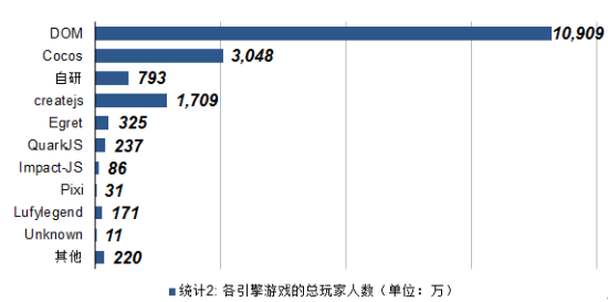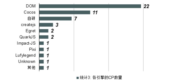 值得一提的是,统计数据中最高的“DOM”是指游戏使用HTML5直接编写而成,没有使用任何游戏引擎(可能使用jQuery等DOM框架),这种游戏的特点往往是游戏逻辑相对简单,或部分挂机类游戏也会选择这种技术框架。除了“DOM”、“Unkown”以外的其他游戏均使用游戏引擎研发而成。