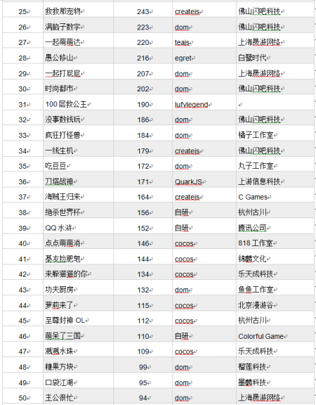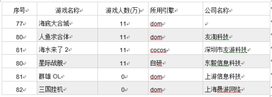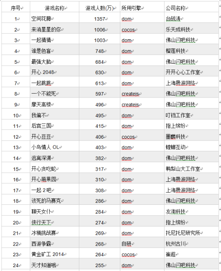 下面附上玩吧2015年3月27日的所有游戏供参考。游戏名、游戏人数、公司名都是根据玩吧里公开的资料,所用引擎为我们脚本根据关键字自动扫描得到的结果。注意游戏人数受上线时间影响较大,不能作为衡量游戏品质的唯一标准。