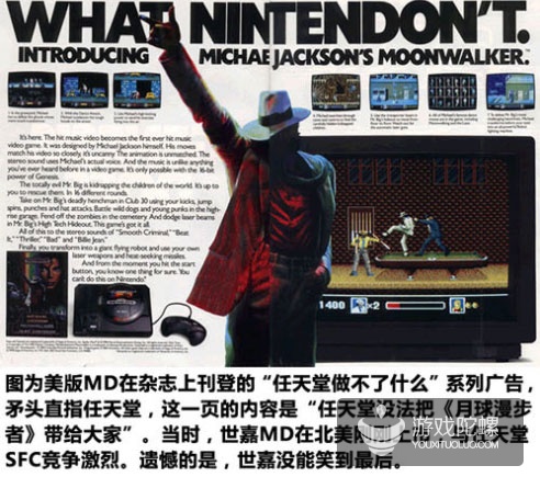 世嘉与任天堂是当时主机时代的死对头,杰克逊对世嘉的支持,甚至打出了“任天堂做不了什么”的系列广告。