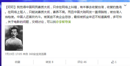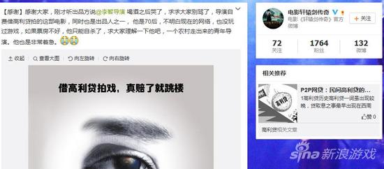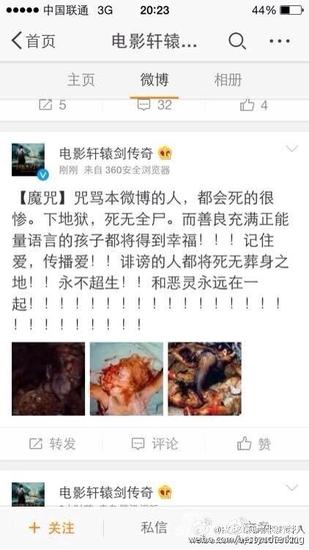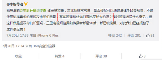 当笔者打开微博,在搜索栏输入“轩辕剑”三个字后,搜到的微博竟然都不是游戏相关。一部名为《轩辕剑传奇》的山寨电影占据了这个词条的大部分微博,而微博内容除了广大网友对该电影秀下限宣传方式的一致嘲讽与抵制外,就是这部侵权电影的官博和导演如何一次又一次的使用诸如“盗用各种知名游戏素材宣传”“自导自演泼粪”、“恶毒诅咒网友”、“侮辱电脑游戏”等下作手段进行如挑梁小丑般的表演。