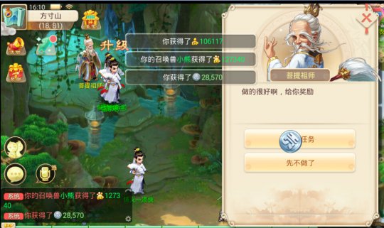 进入《大话西游手游》后略显Q版小清新的风格还是让我有些不适,越看越觉得像《梦幻西游手游》,也许是玩《梦幻西游手游》太多的缘故吧。(勿喷!)但游戏中的场景在人物走动中有远近之区分;建筑物的样式让我有种身临大话2的感觉;《大话西游手游》整体画面非常之细腻,人物和物体刻画的也非常入微,层次感十分鲜明,能感觉到网易的用心与细心。