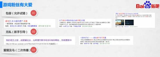 获得粉丝其实只是一个开始,并没有把粉丝的全部能量发挥出来,因为这里还没有涉及到游戏的深度运营。所谓深度运营指的是把用户关系带入到产品当中去,虽然贴吧是弱关系的平台,用户之间互不认识,也没有什么爱和恨,但吧与吧之间是认识的,有友好和对抗的关系。贴吧有一种非常著名的现象叫做爆吧,集中体现了吧与吧之间的爱恨情仇。贴吧游戏未来要做的是让用户用爆吧的热情参与到游戏中,比如去打国战,这是我们现在努力的方向,做出成绩后再跟大家分享。”