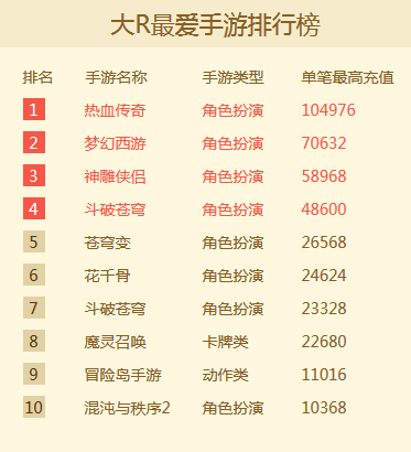 大R最爱手游排行榜本期浮动较大,除了第一位的《热血传奇》未变,其他名次变化较大,不过角色扮演类游戏依旧是大R玩家们偏向的重点,卡牌类游戏《魔灵召唤》也是大R排行榜的老面孔,在新游的宣传冲击下,经典游戏的地位未在大R心中改变。(数据来源:7881)
