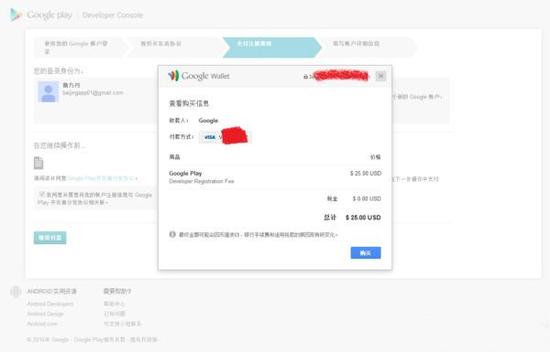 2、登入开发者后台,链接地址:https://play.google.com/apps/publish/signup/,并点击“继续付款”,