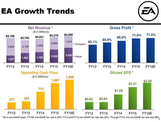 EA过去12个月NON-GAAP收入为41.63亿美元,其中数字游戏收入23.07亿美元,数字游戏NON-GAAP净收入为7.74亿美元,运营现金流8.18亿美元。得益于收入超出预期的利好消息,该公司提高了2016财年的整体净收入预测至45亿美元,每股收益预期也从15美分提高至30美分。,运营现金流预期提高至12亿美元。
