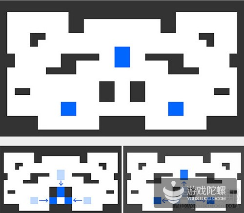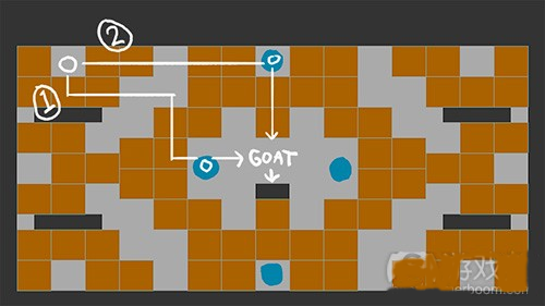 2。追随者会耐心等待门的开启,但在他等待的时候,运送山羊的玩家将开始朝着关卡中心移动。根据追随者的下次移动,山羊运送者会选择与之相反的路线,并再一次获得安全。