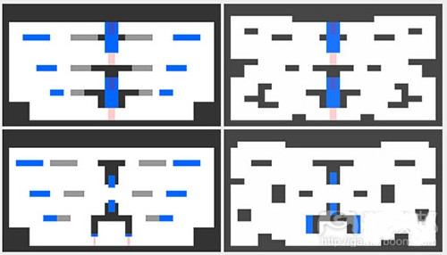 是的,上图并未呈现出这些设计中的全部内容,但我们可以看出蓝色组块可以在两个配置间交替变化。创造一个双重布局关卡最难之处在于确保这些布局足够有趣。大多数情况下你只能创造一个好的开始,而一旦关卡开始转化,它便会迅速变得平庸。或者你最终将只会创造一个以你未能预测到的方式压倒玩家的碰撞。也就是说我们还需要花时间进行尝试,但我们也创造了一些带有潜力的内容:
