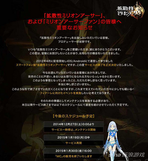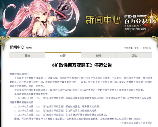 今日,由盛大游戏代理的《扩散性百万亚瑟王》国服官方发布了停运公告,宣布计划于2016年1月25日11:00正式停止《扩散性百万亚瑟王》在中国大陆地区的运营,随后在2016年2月25日11:00时《扩散性百万亚瑟王》官方客服QQ群及客服邮箱服务也会正式停止。(附官方停运公告:请点击)