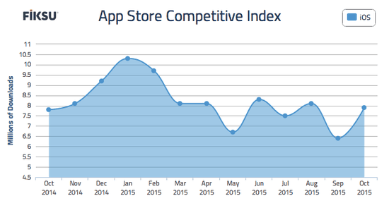 移动应用分析公司Fiksu近日发布了最新一期Fiksu指数报告。根据报告结果显示,受苹果公司发售iPhone 6S推动,在今年10月份,美国前200款热门免费iOS应用的日均总下载量达到790万次,环比增长23%,略高于去年同期。