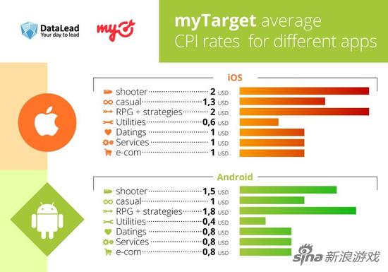myTarget平台包括VK、OK和MoiMir这三个社交网络,覆盖用户数量超过5千万人。发行者会自己由CPC收费模式、或者借助第三方按照CPI模式从myTarget平台上获得流量。目前在俄罗斯市场上最流行的应用种类是手游以及移动电商。