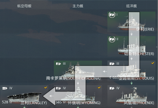 想要使用航空母舰“兰利”则需要先获得科技线上前置的几艘战舰,然后每一艘战舰都累积经验研究下一艘战舰。而这个过程中为了放置战舰必须不断开启额外的船位。同时为了更快积累战斗经验,需要在每艘战舰中添加增强配件,对银币与经验值进一步产生需求。