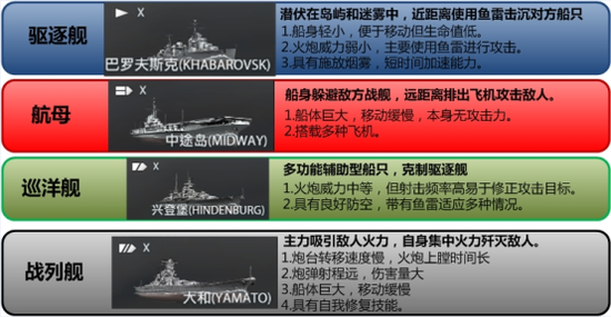 战列舰,巡洋舰,驱逐舰,航母都各有不同的操作体验。而按国家划分同一种战舰的战斗方式也有不同。玩家为了不被局限于一种玩法体验会同时拥有多种战舰。