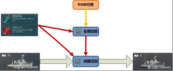 经验分为全局经验与战舰自身经验,每次战斗根据玩家造成的伤害量给予战舰经验,同时会给予战舰经验的5%作为全局经验。玩家可以通过付费将全局经验转换为目标战舰的经验值。