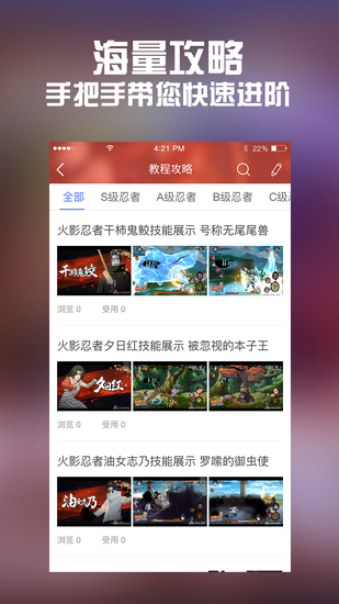 《全民手游攻略 for 火影忍者》APP是新浪游戏专为《火影忍者》手游玩家量身打造的一款攻略APP。涵盖《火影忍者》手游大量原创游戏攻略、采集官方最完整的资讯、资料;提供最丰富的原创视频攻略。该APP除了最基本的游戏资讯、攻略和心得以外,“社区问答”功能更是必不可少。《全民手游攻略 for 火影忍者》APP是玩家获取《火影忍者》手游攻略的第一首选,轻松上手、PK无忧。