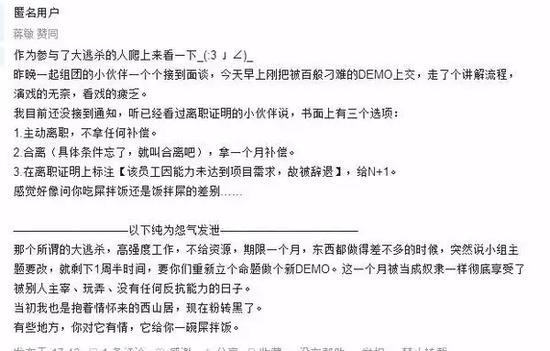 举一个具体例子,近期西山居开始进行大幅度劝退,方式则是动员项目组以高强度工作开发DEMO,依靠不得要领的KPI考核促使员工离职: