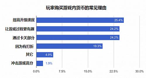 如何设置游戏内购无疑是一门学问。而根据TapResearch的研究报告,实际上只有很少一部分玩家乐意在游戏或是其他应用中大笔花钱。但同时,大部分玩家需要额外的虚拟物品来提升自己的游戏体验。如图所示,玩家需要虚拟货币的理由多种多样。