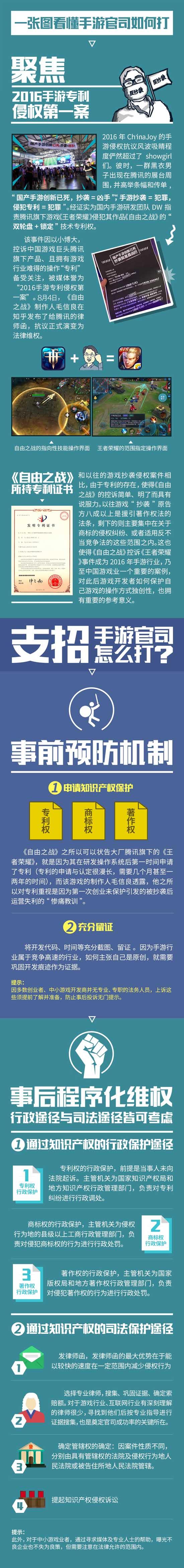 进入移动互联时代后,手游几乎成为手机里的“标配”应用,动漫、游戏产业已然成为万亿级别的“新风口”行业。产业发展直接带来的是侵权官司的直线飙升。作为文学艺术与数码技术、互联网技术的复合体,动漫、游戏知识产权的保护往往呈现专利、著作权、商标权、反不正当竞争、计算机软件等多个领域的知识产权法律问题相互交织的特点……这使得许多游戏业者,特别是创业者却不知道官司该怎么打?要哪些证据?一起看下图来了解吧!
