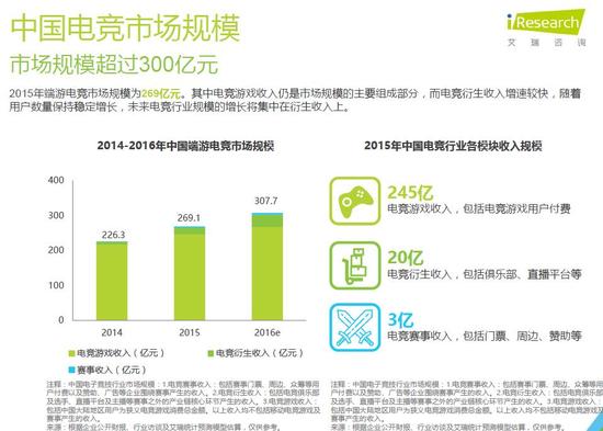 根据艾瑞统计数据显示,到2018年,中国电竞用户将达到2.8亿人次,端游电竞市场规模2015年已经达到269亿元。与此同时,随着电竞行业商业模式的日趋完善,电竞衍生领域有望成为未来新蓝海。数据还显示,2016年端游电竞市场规模预计将达到307.7亿元,然而电竞衍生收入将成为未来电竞行业新的利润增长点。